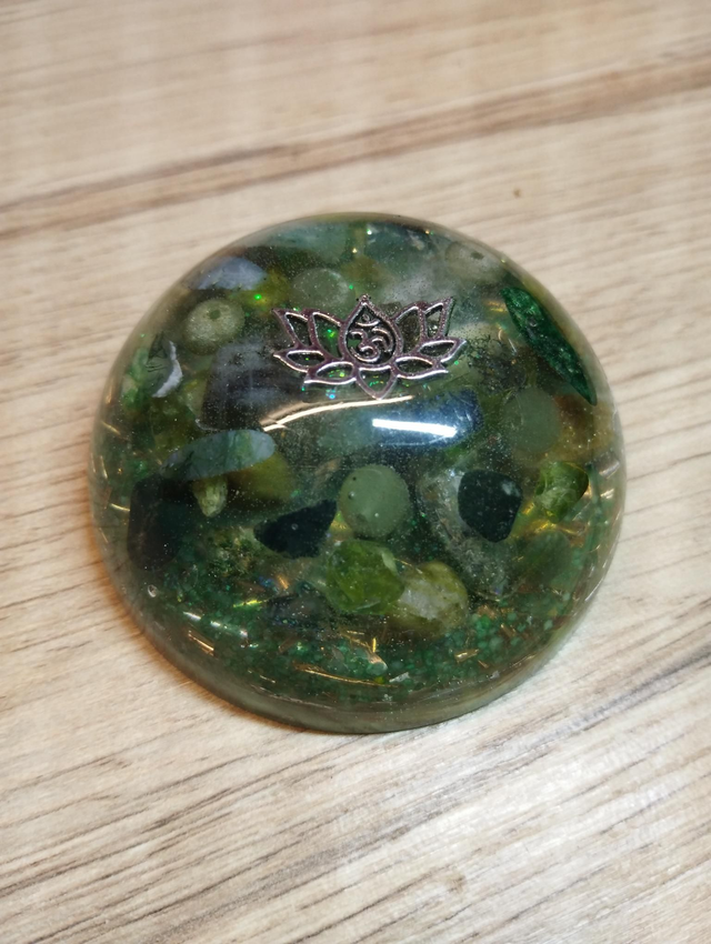 1/2 sphère en Orgonite avec de l'Aventurine, Peridot, Agathe Verte, Malachite..