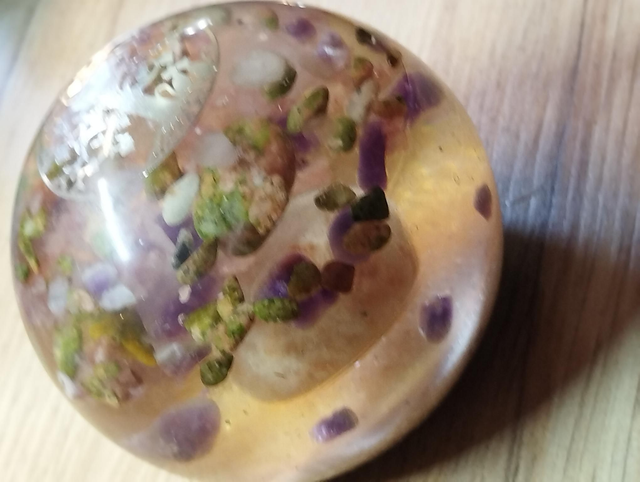 Orgonite en forme de Sphère sérénité avec Unakite, Pierre de lune ,Quartz Rose, Améthyste.